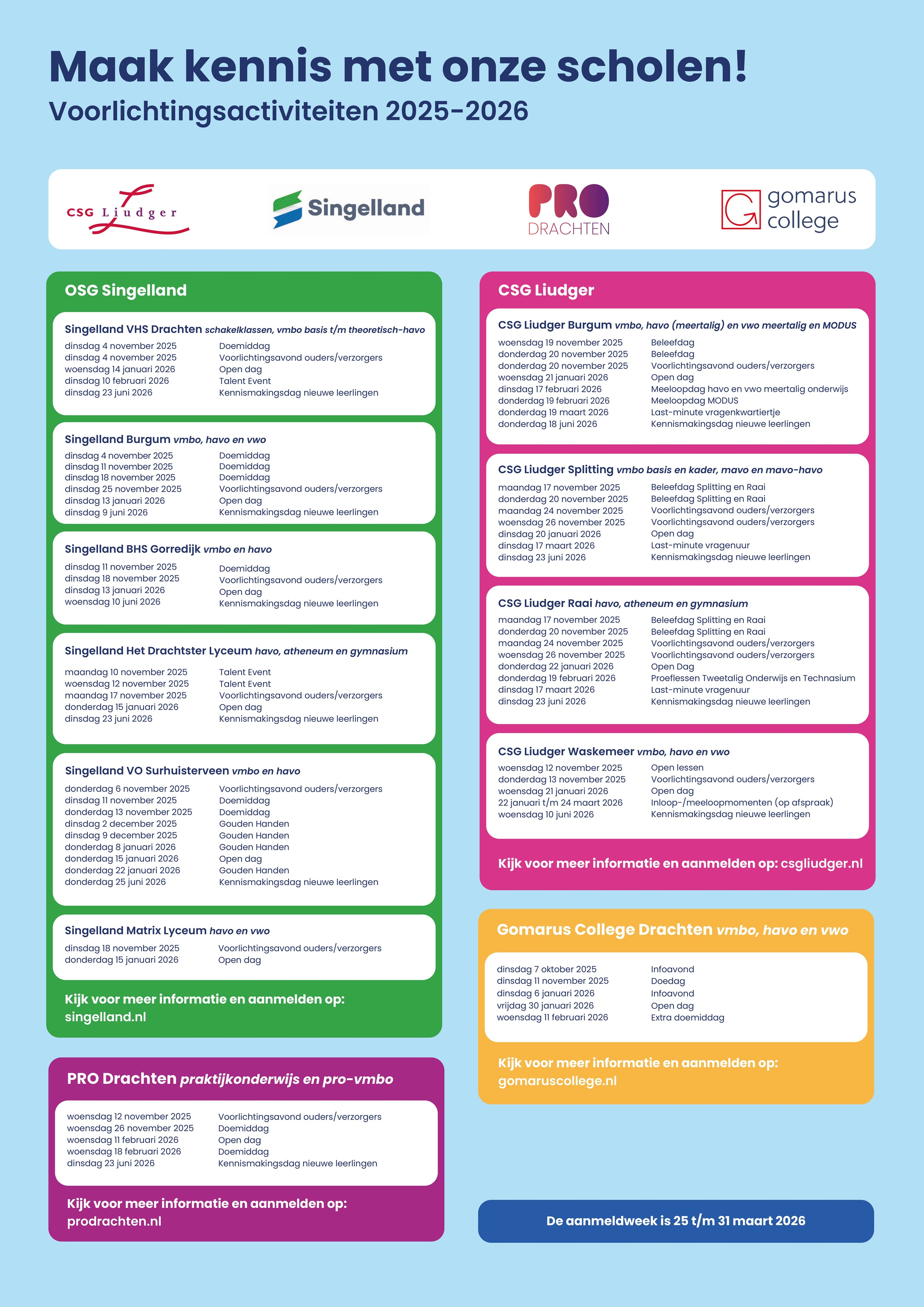Info voor oudersScholen CSG Liudger, OSG Singelland en PRO DrachtenVoorlichtingsactiviteiten CG Liudger, OSG Singelland, PRO Drachten en Gomarus CollegeRoutekaartHet Voortgezet OnderwijsBegeleidingLeerplichtFinancieelStudievaardigheden - Leren lerenVeel gestelde vragenVeel voorkomdende afkortingen Adenium Naar de website CSG Liudger Naar de website OSG Singelland Naar de website